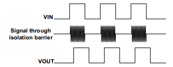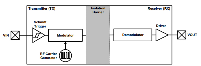產(chǎn)品采用先進(jìn)的電路技術(shù)可以有效的抑制載波信號(hào)和 IO 開(kāi)關(guān)引入的 EMI。 相比于電感耦合隔離架構(gòu), 電容耦合架構(gòu)具有更高的電磁抗干擾能力。 OOK 調(diào)制方案消除了脈沖調(diào)制方案中可能出現(xiàn)的脈沖丟失引起的誤碼現(xiàn)象。 圖 9-1 和圖 9-2 分別為單通道功能框圖和 OOK 開(kāi)關(guān)鍵控調(diào)制方案波形示意圖。